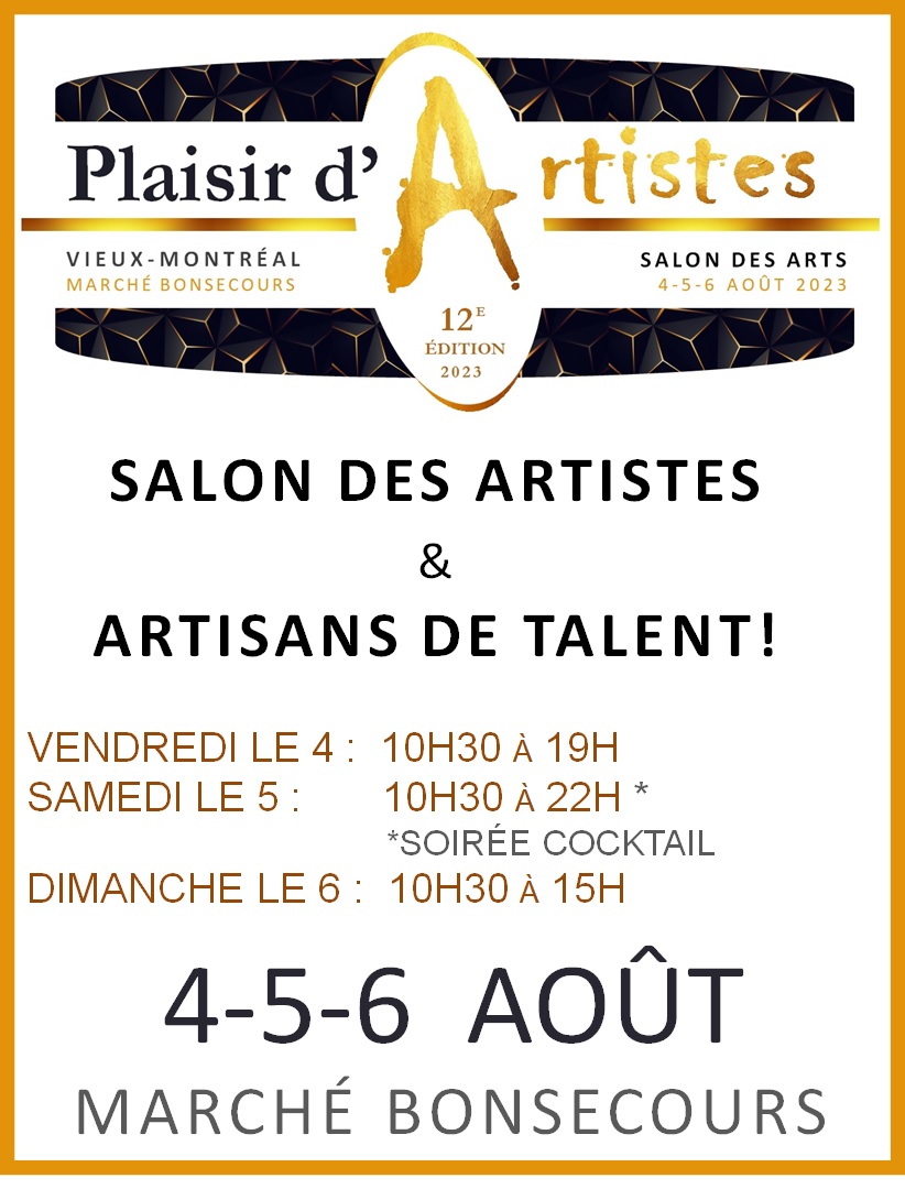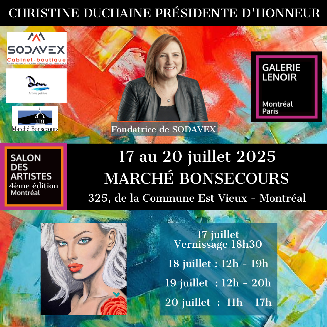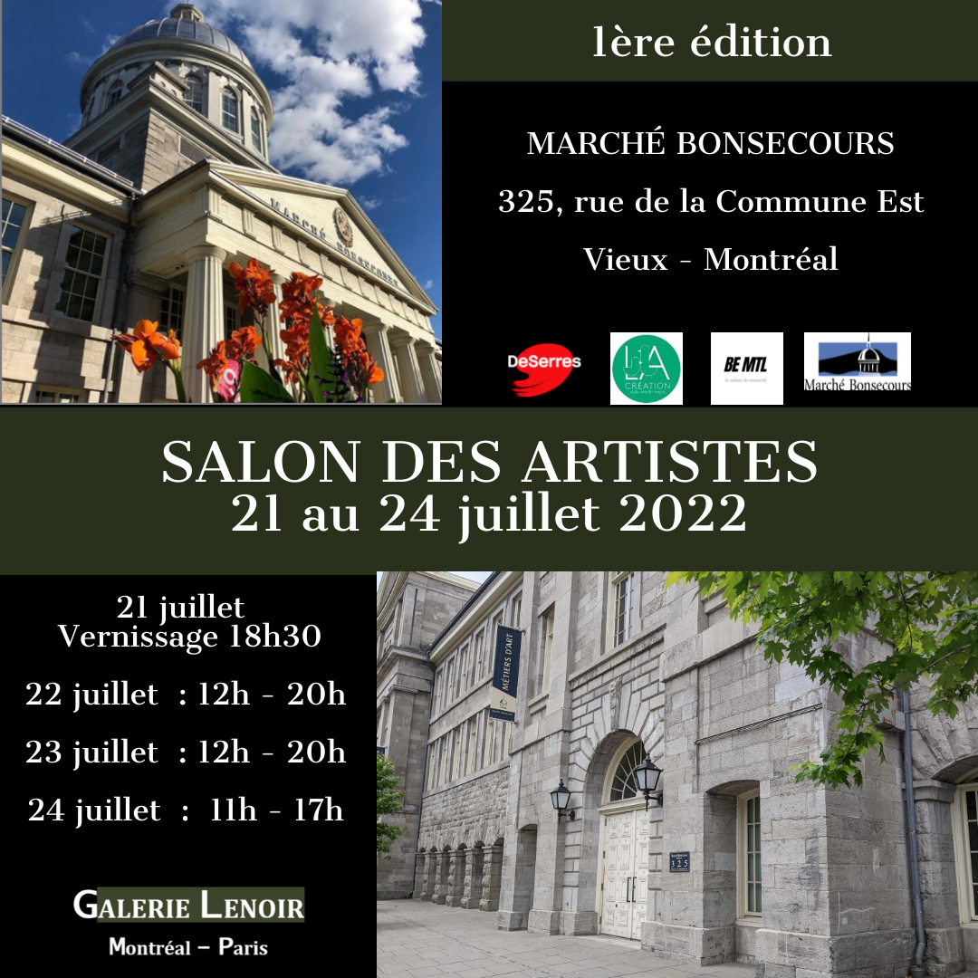 Le Salon des Artistes est de retour pour sa 4e édition, du 17 au 20 juillet 2025, au Marché Bonsecours, dans la salle de la Commune, située au 325, rue De la Commune Est. L'événement est organisé par la Galerie Lenoir.