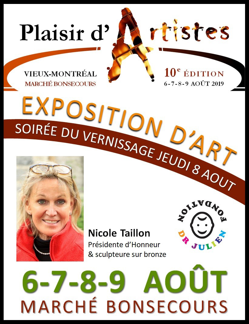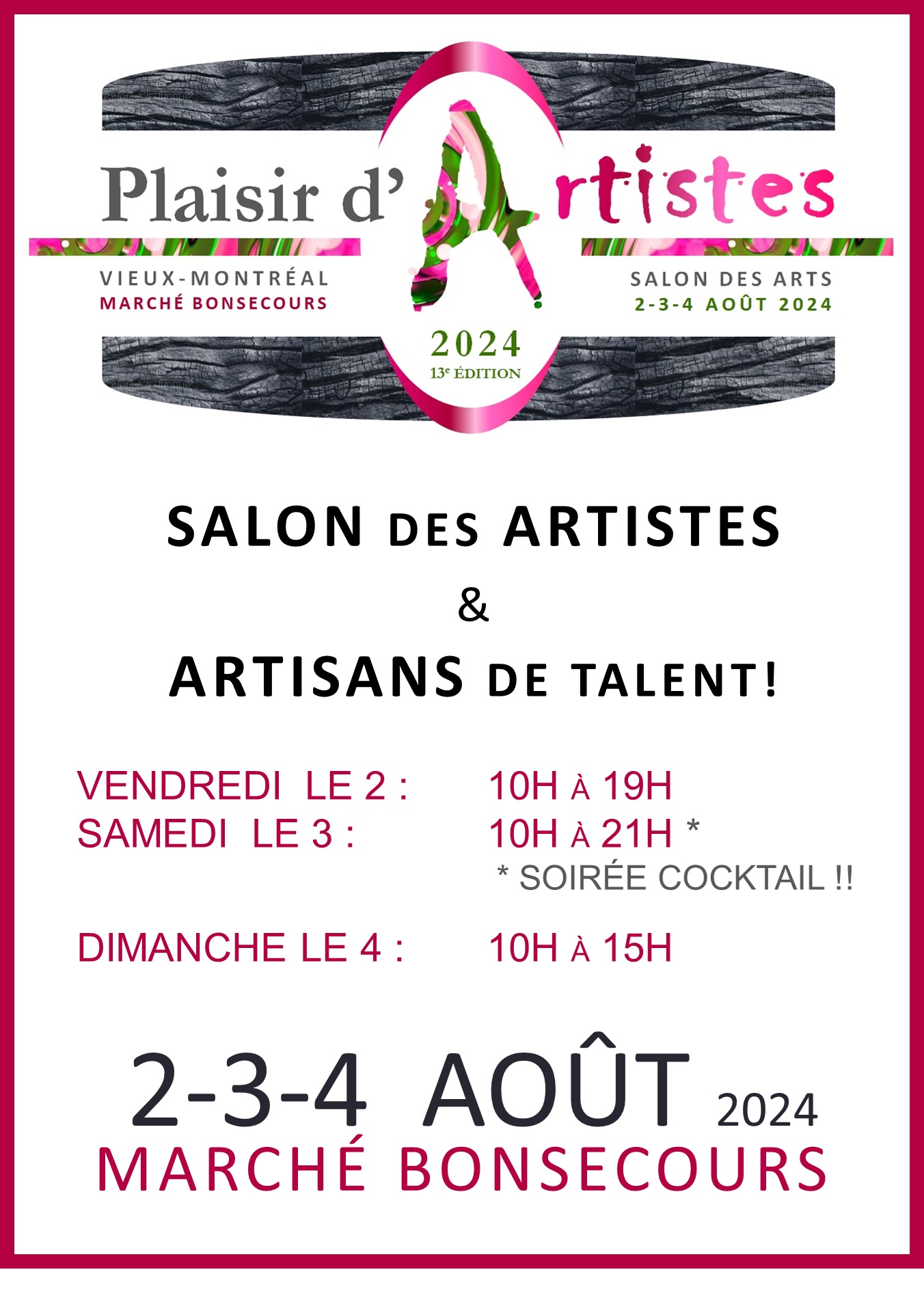 Peinture, sculpture sur pierre, sculpture sur métal et bois, aquarelle, dessin, pastel, sculpture sur bois, bronze, verre, bijoux uniques et bien plus vous attendent au Marché Bonsecours les 2-3-4 août prochains !